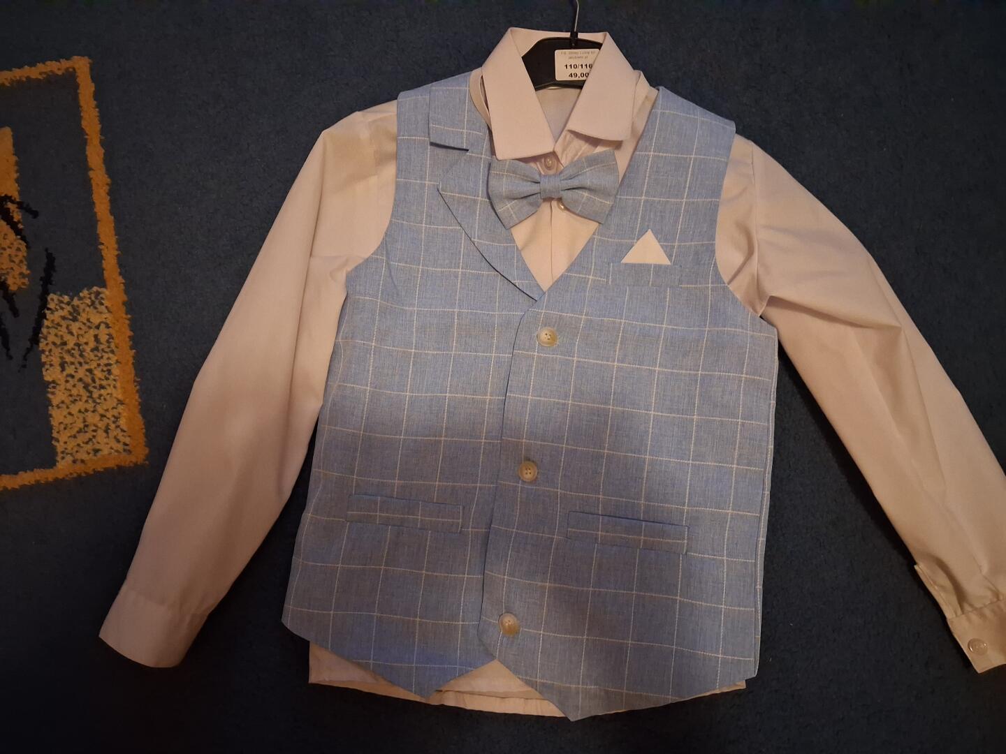 Sprzedam nowy elegancki garniturek do tego spodnie niebieski w kratkę jak kamizelka na matce 130 dla chłopca 7.8 lat.